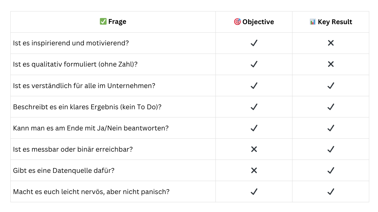 ✅ Binär erlaubt? An dieser Frage scheiden sich die Geister. Ich sage ganz klar “Ja” unter bestimmten Bedingungen. → Ja/Nein-Ziele wie „Der neue Onboarding-Prozess ist live“ sind legitim, wenn keine bessere Metrik vorliegt. Nennt sich auch binäres Key Result. Und ist besser das als eine schlechte Zahl, die man sich aus dem Ärmel gezogen hat.